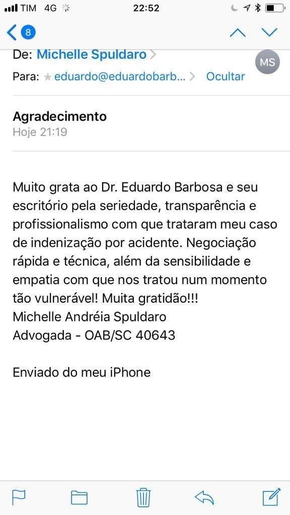 O trabalho desenvolvido pelo escritório Eduardo Barbosa Advogados foi de excelente qualidade, principalmente por tratar de um assunto difícil que foi o acidente de trabalho envolvendo meu pai...